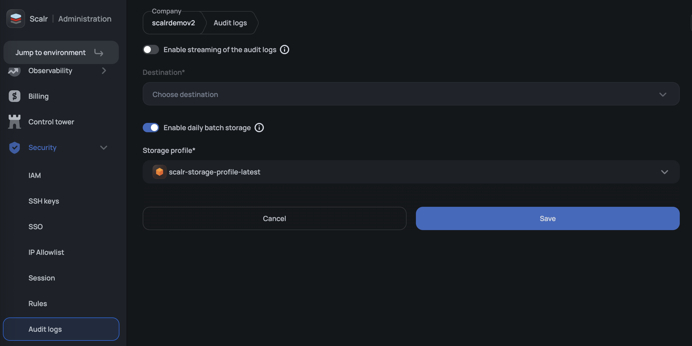 To enable: Navigate to Audit Logs and select a storage profile. You will need an existing storage profile configured with credentials for your target bucket.