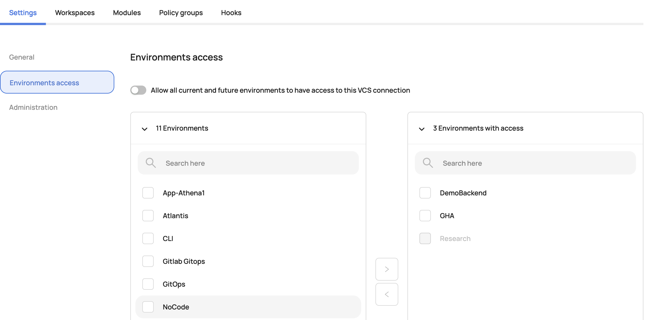 Once a VCS provider integration is successful, the provider can be made available to the entire account or select environments if access should be limited. All users who have access to create/update a workspace will be able to select the provider and the repositories to link to their workspace.