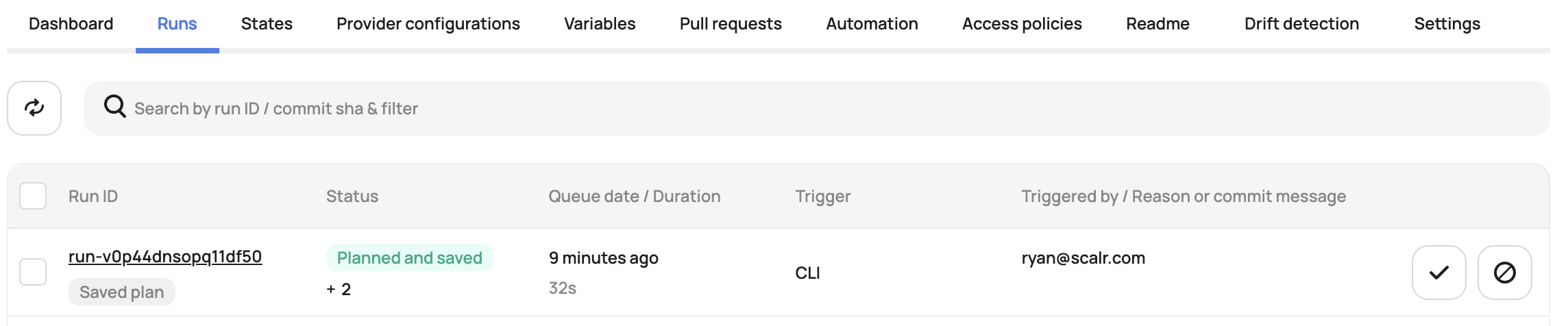 These runs can then be applied directly in the UI or using tofu apply FILENAME: