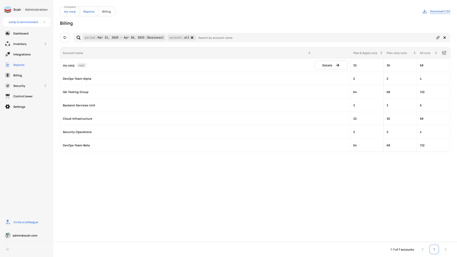 Control Tower is a feature that allows account administrators to link multiple Scalr accounts under a unified billing structure. This feature enables organizations to manage billing across multiple accounts from a single parent account. This is particularly useful for organizations with multiple business units that need separate Scalr accounts but want to consolidate their bills, as well as for Managed Service Providers (MSPs) managing multiple client accounts under a unified billing structure.Retry