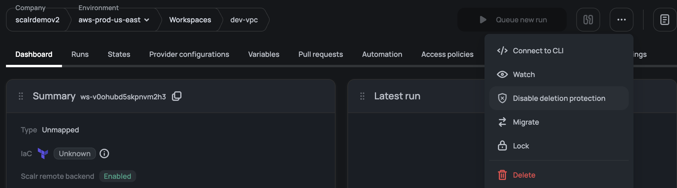 To disable deletion protection, click on the three dots (...) at the top of the workspace: