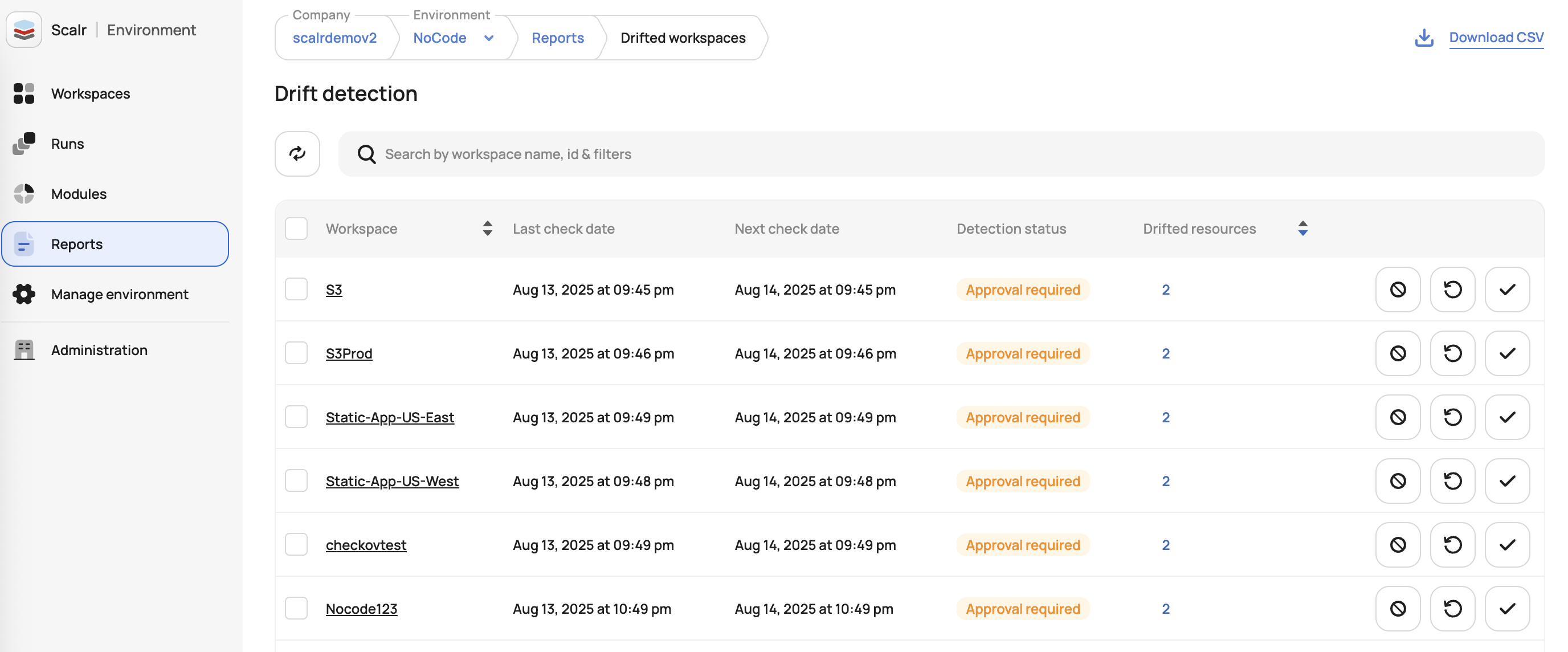 Drift reports can be seen within the environment scope reports. The drift detection report shows when the last time the drift was checked, the next scheduled drift check, and the current status. Users can then take action on the drift directly from the report.