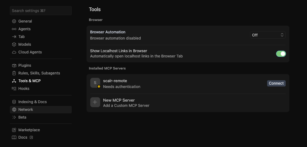 The Scalr remote MCP server is the simplest way to get started. It requires no Docker, no local setup, and no infrastructure to maintain. Just enable it in your account settings and connect your AI client.