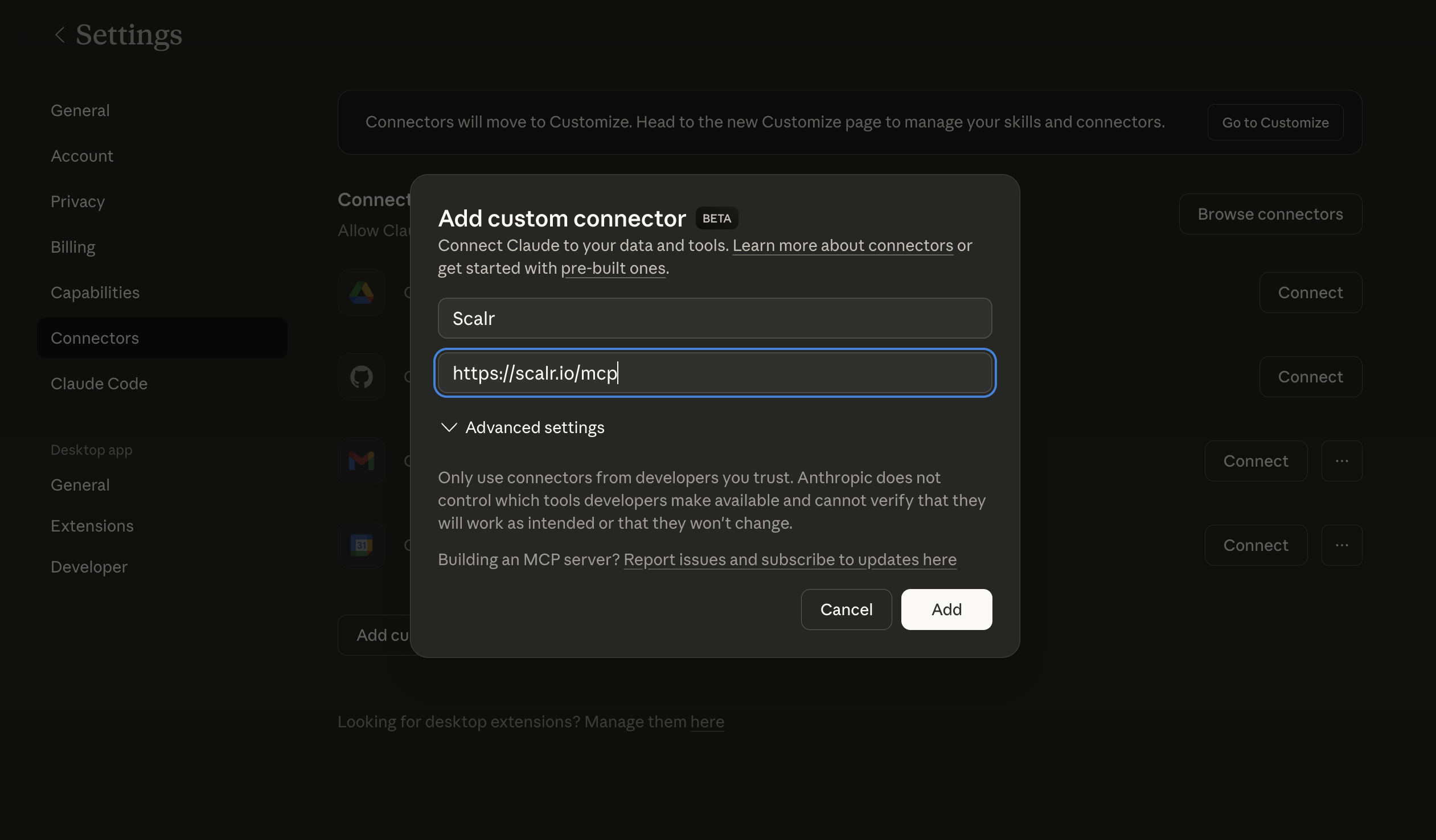 In Claude, go to Settings, Connectors, and click "Add custom connector". Add https://scalr.io/mcp as the URL for the MCP server. Click connect, and you will be redirected to Scalr to authenticate.