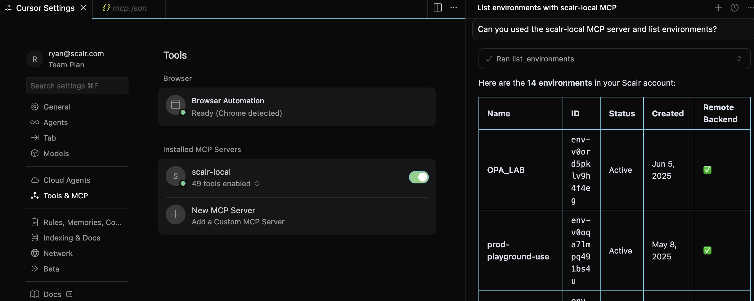 In Cursor, you can validate that the MCP server is running and execute a test prompt to make sure you are receiving answers back: