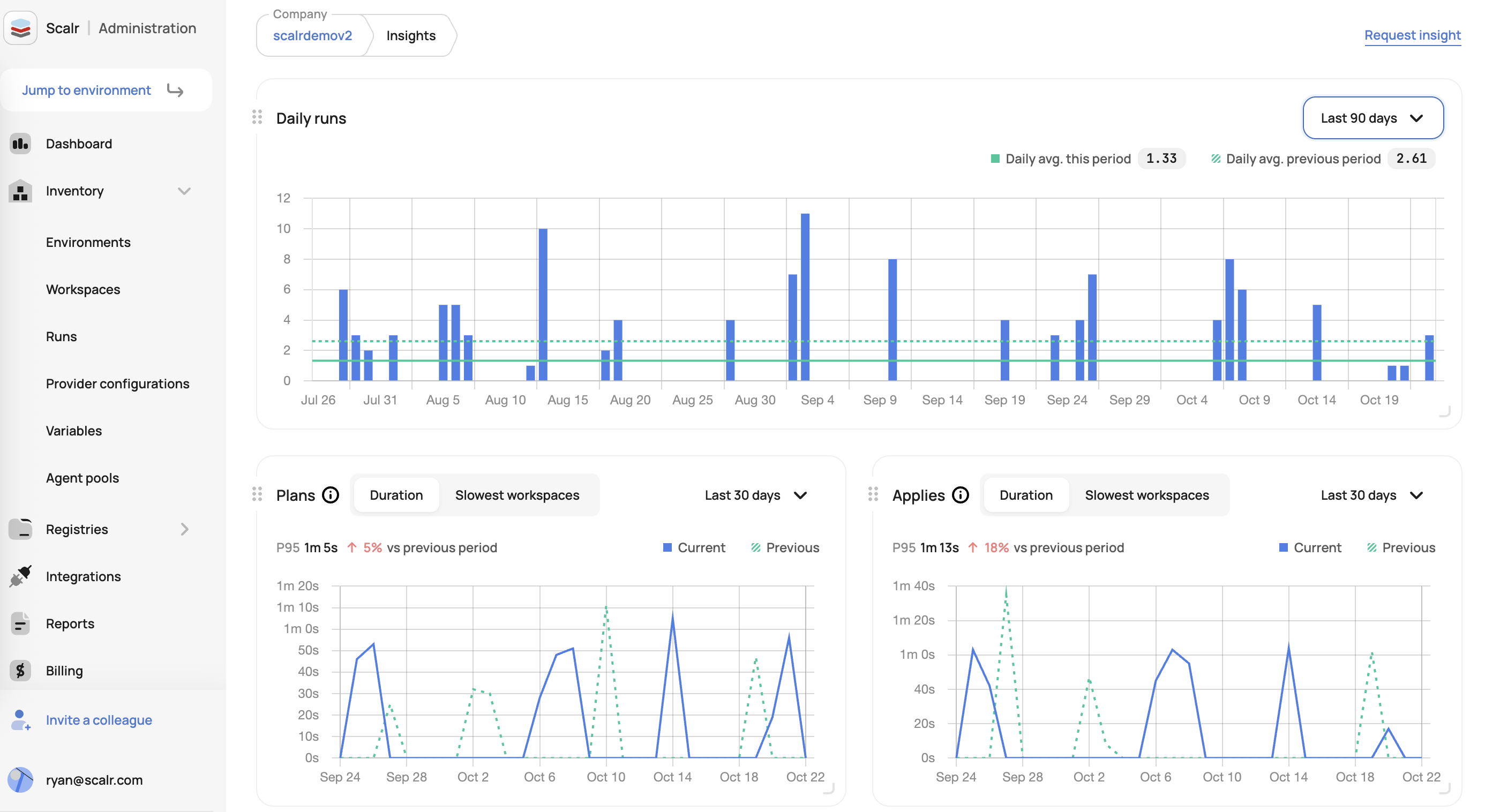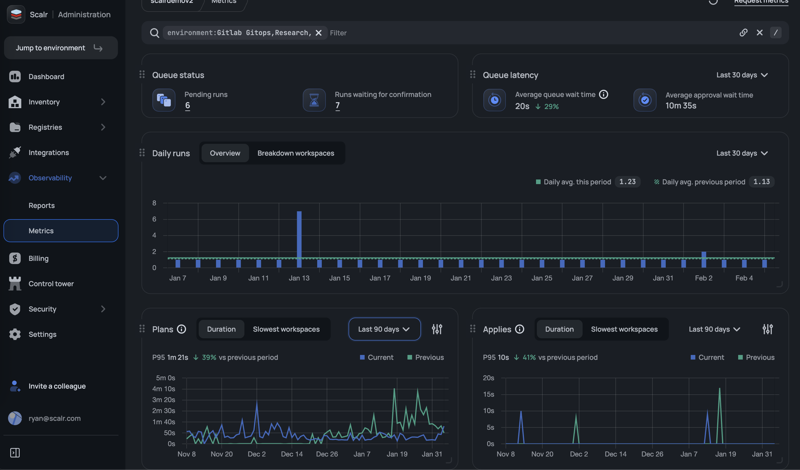 The Scalr Metrics feature automatically surfaces critical performance metrics and patterns that might otherwise go unnoticed, enabling teams to identify and proactively address bottlenecks. With Metrics, you'll have the data you need to optimize your infrastructure automation and maintain peak efficiency across all workspaces.