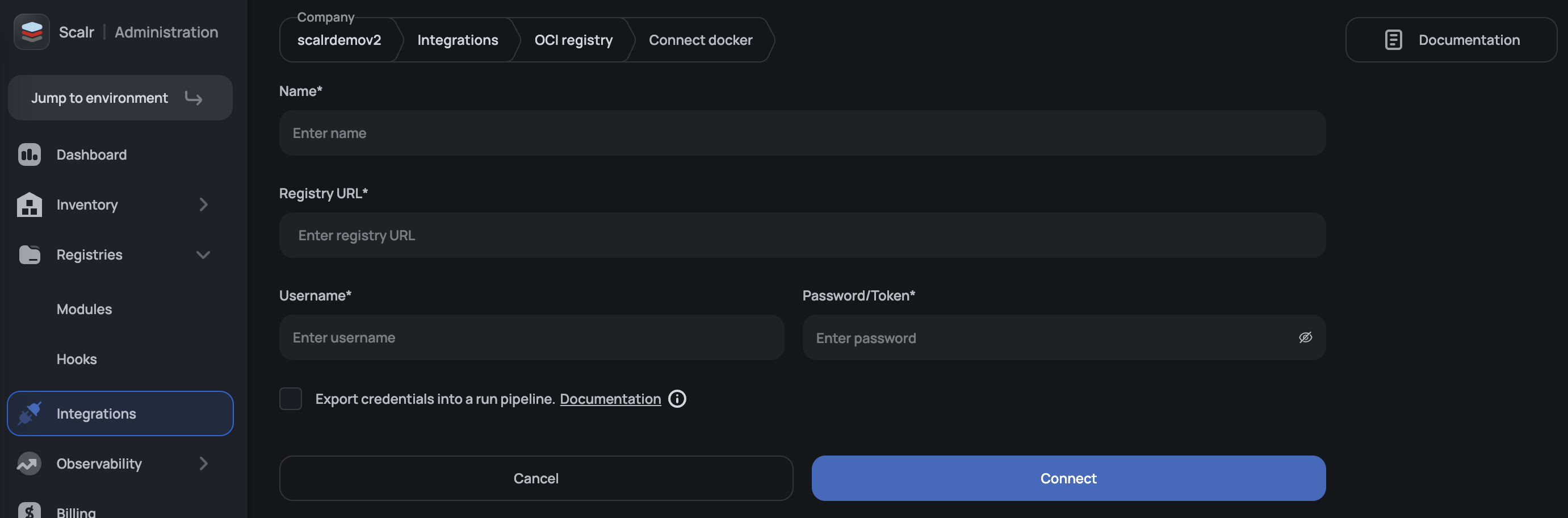 When you create a Docker-compatible registry integration and enable Export credentials, Scalr securely injects the stored credentials into every plan and apply run on the account. Supported agents then write the credentials into the Docker auth configuration used by OpenTofu, which lets tofu init pull modules from the registry over oci:// without any further configuration on the workspace or in source code.