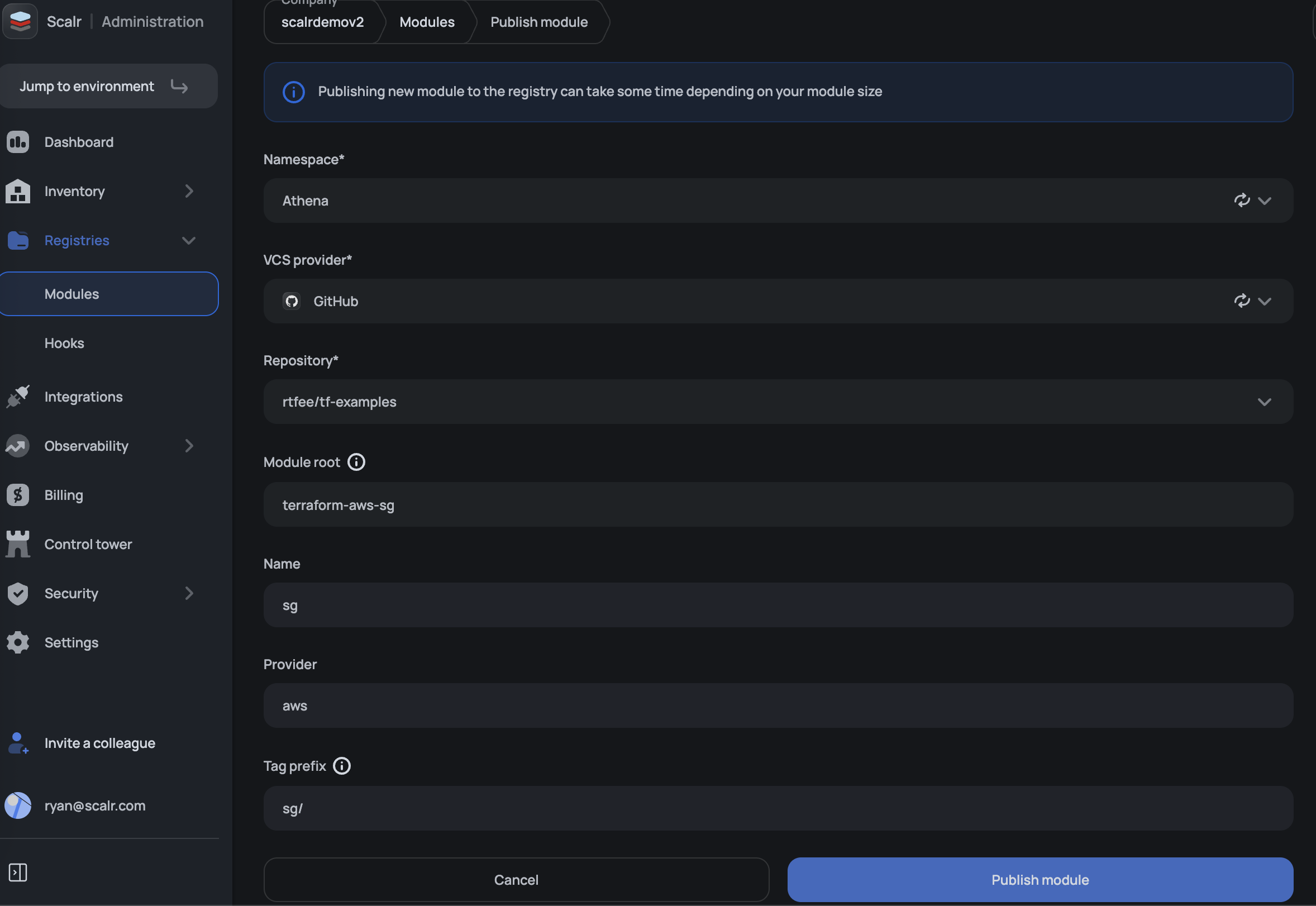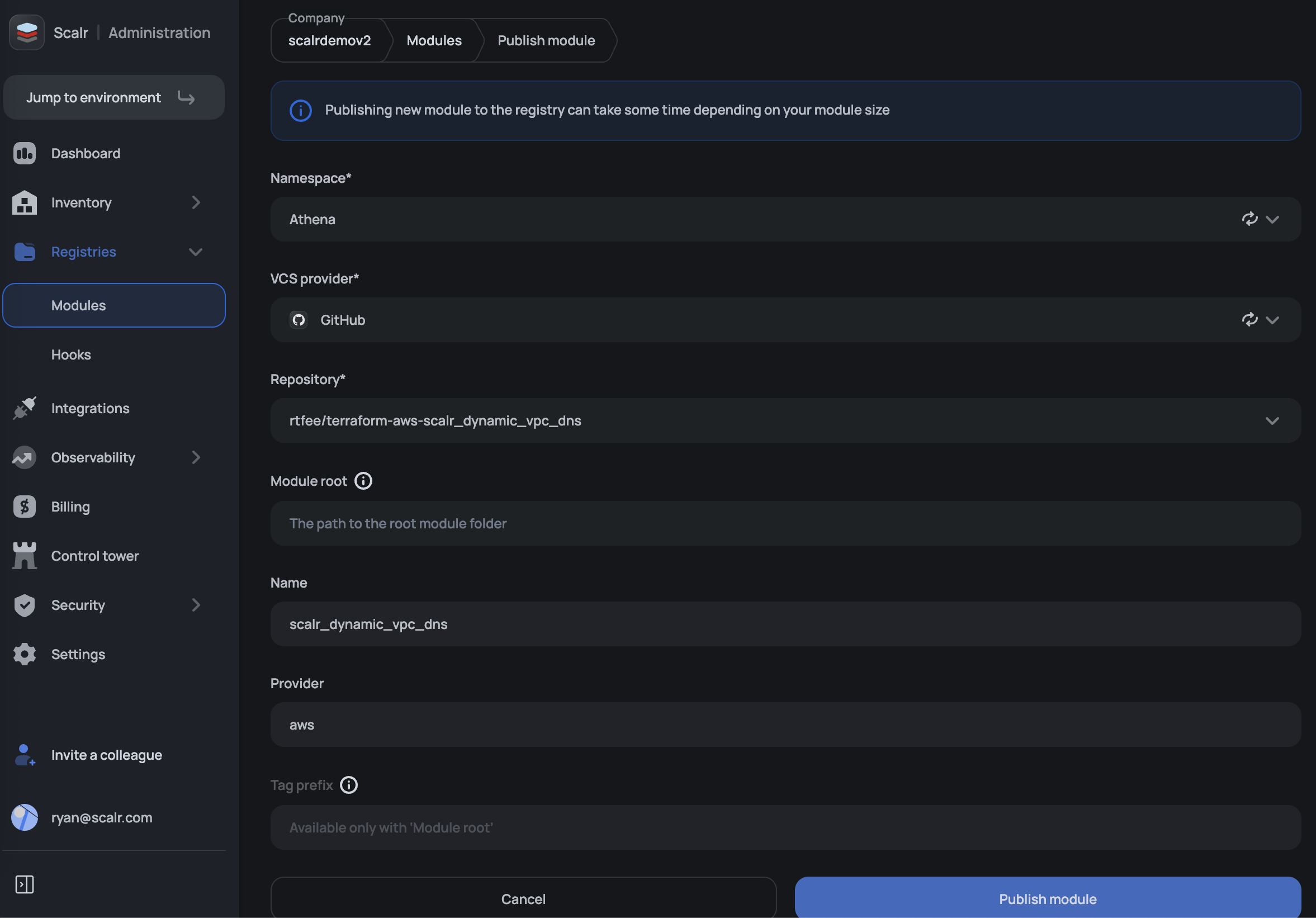 Modules must be published into a module namespace at the Scalr account scope. The namespace is how you can organize your modules, assign ownership, and share them with environments or the entire account.