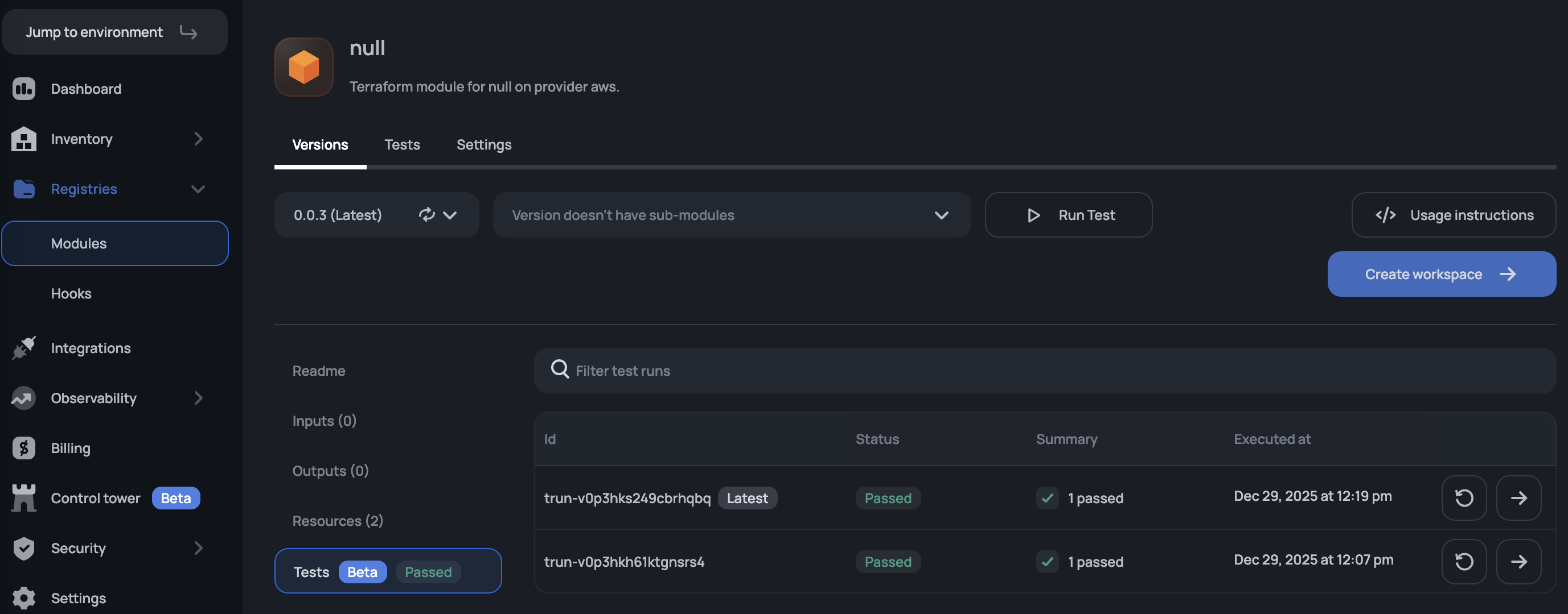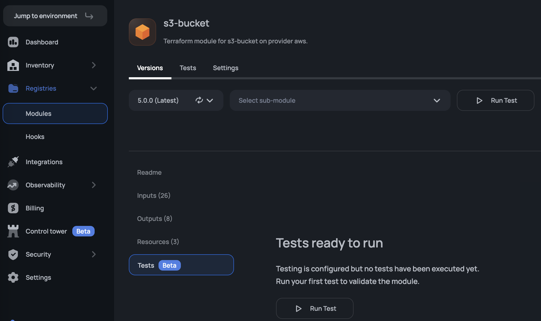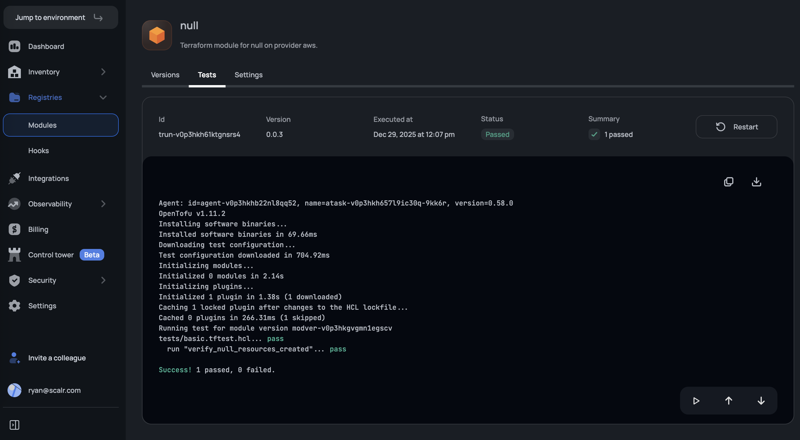 Scalr's module testing feature allows you to validate your private modules using OpenTofu's native test framework before they're used in workspaces. This helps ensure module quality and catches issues early in the development cycle.