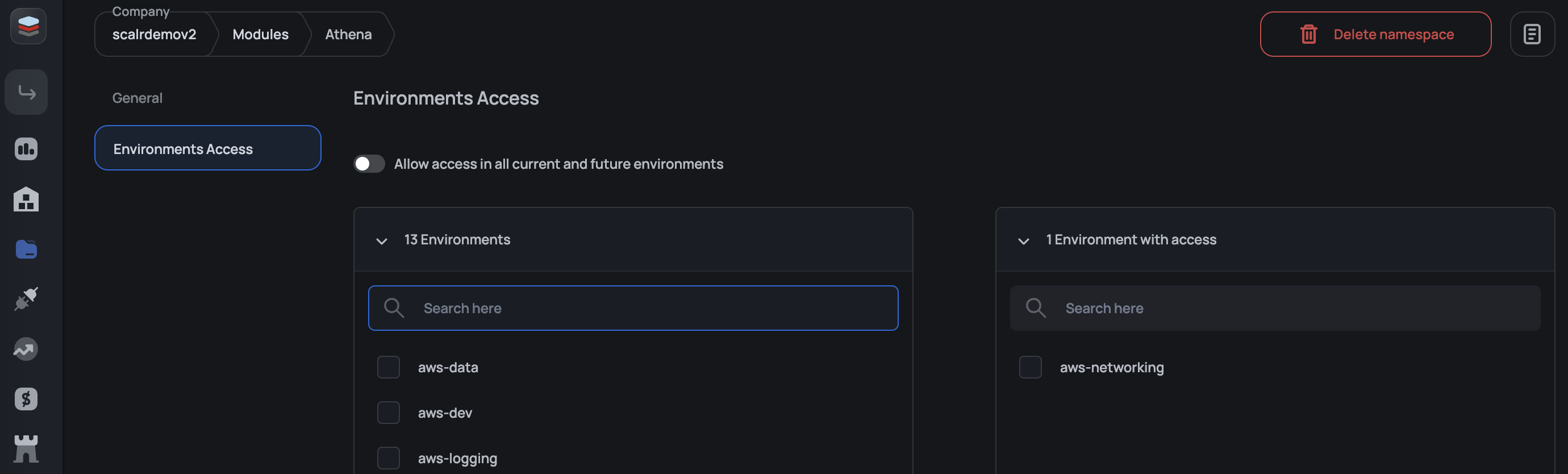 Team ownership can be assigned to a namespace, allowing teams to independently create and manage their own namespaces and assign them to specific environments.