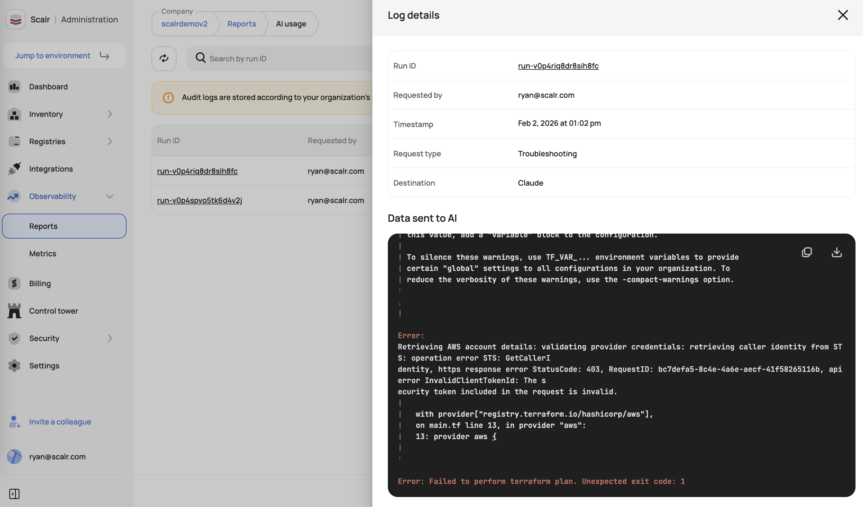 Note: AI audit logs are only available on the Scalr enterprise plan.