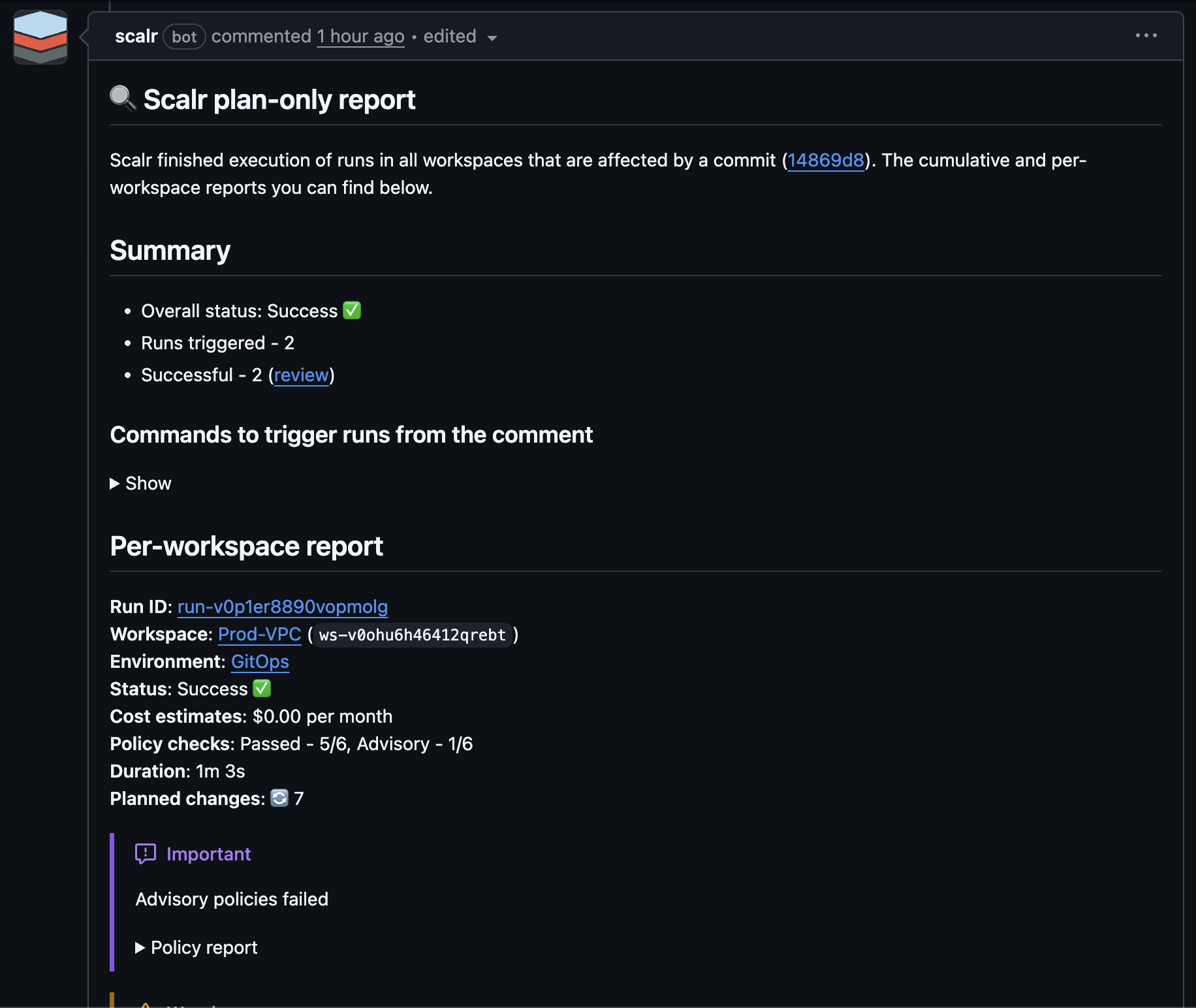 If the "Send summary back to PR comments" is enabled in the VCS integration settings, Scalr will send plan summaries back to the PR comment: