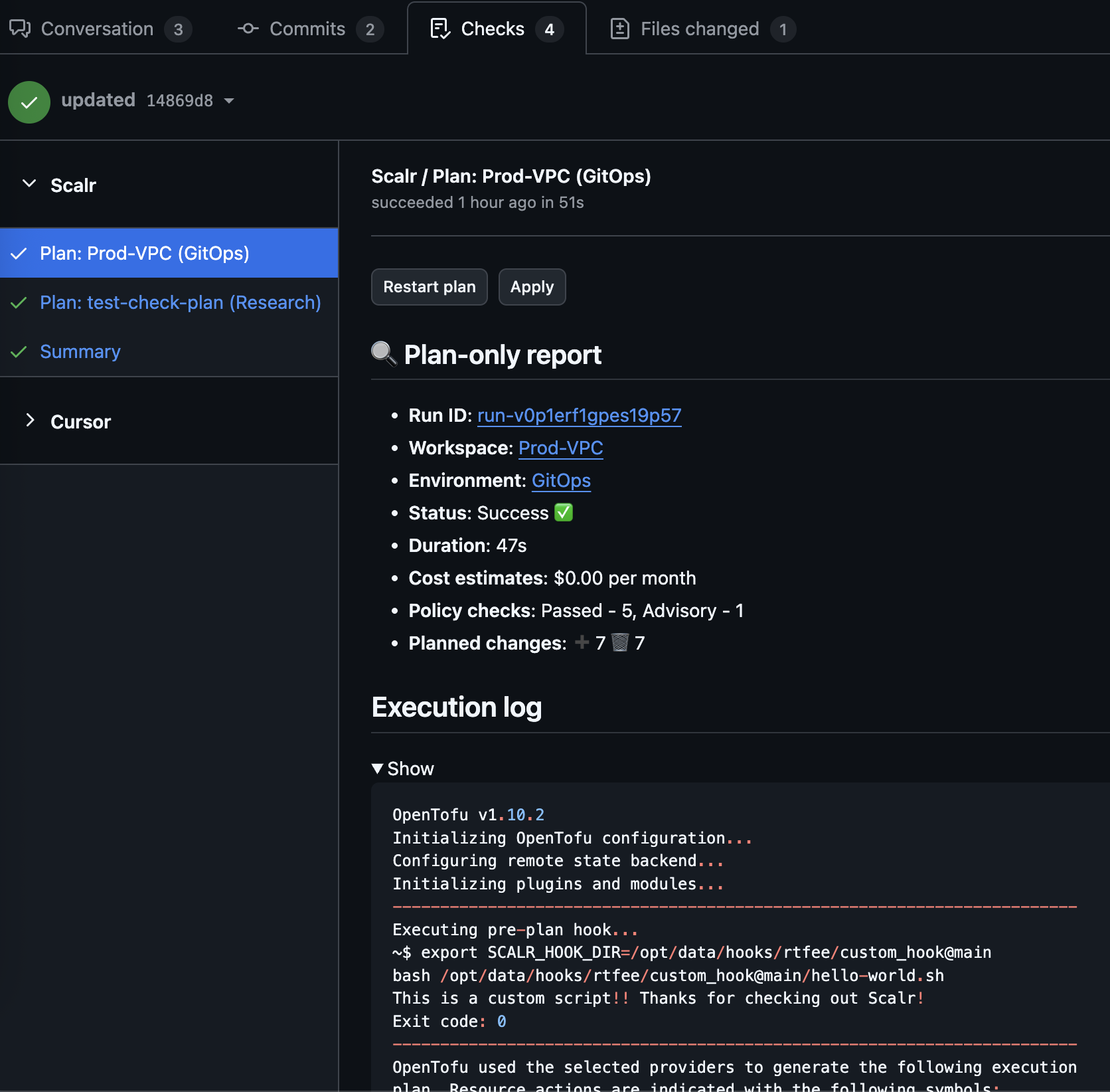 /scalr plan | Executes a dry run in Scalr and results are returned to the VCS provider. |