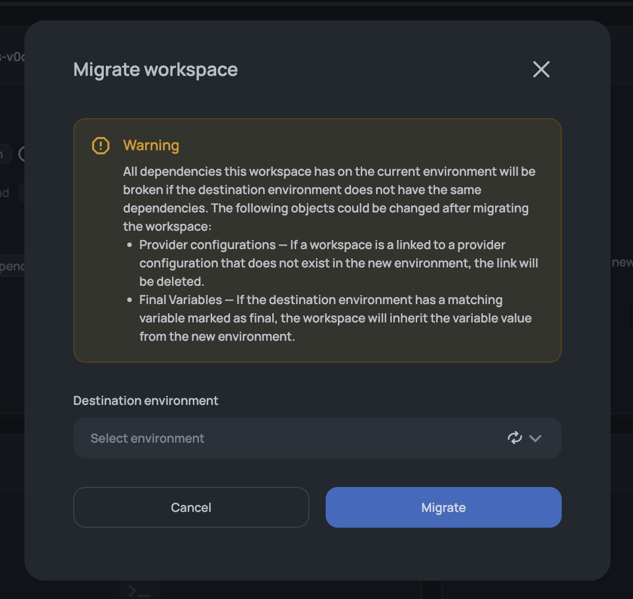 - You cannot migrate a workspace if it is using a module published in the source environment.