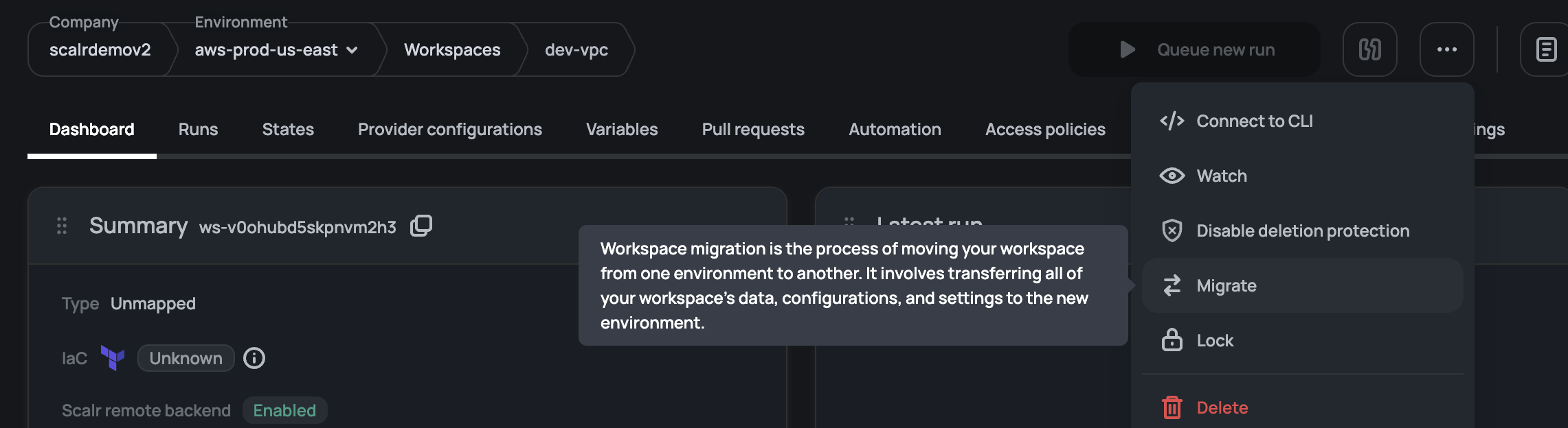 The workspace migration feature allows you to migrate workspaces from one environment to another while keeping the current state, variables, state history, workspace settings, access policies, and runs history.