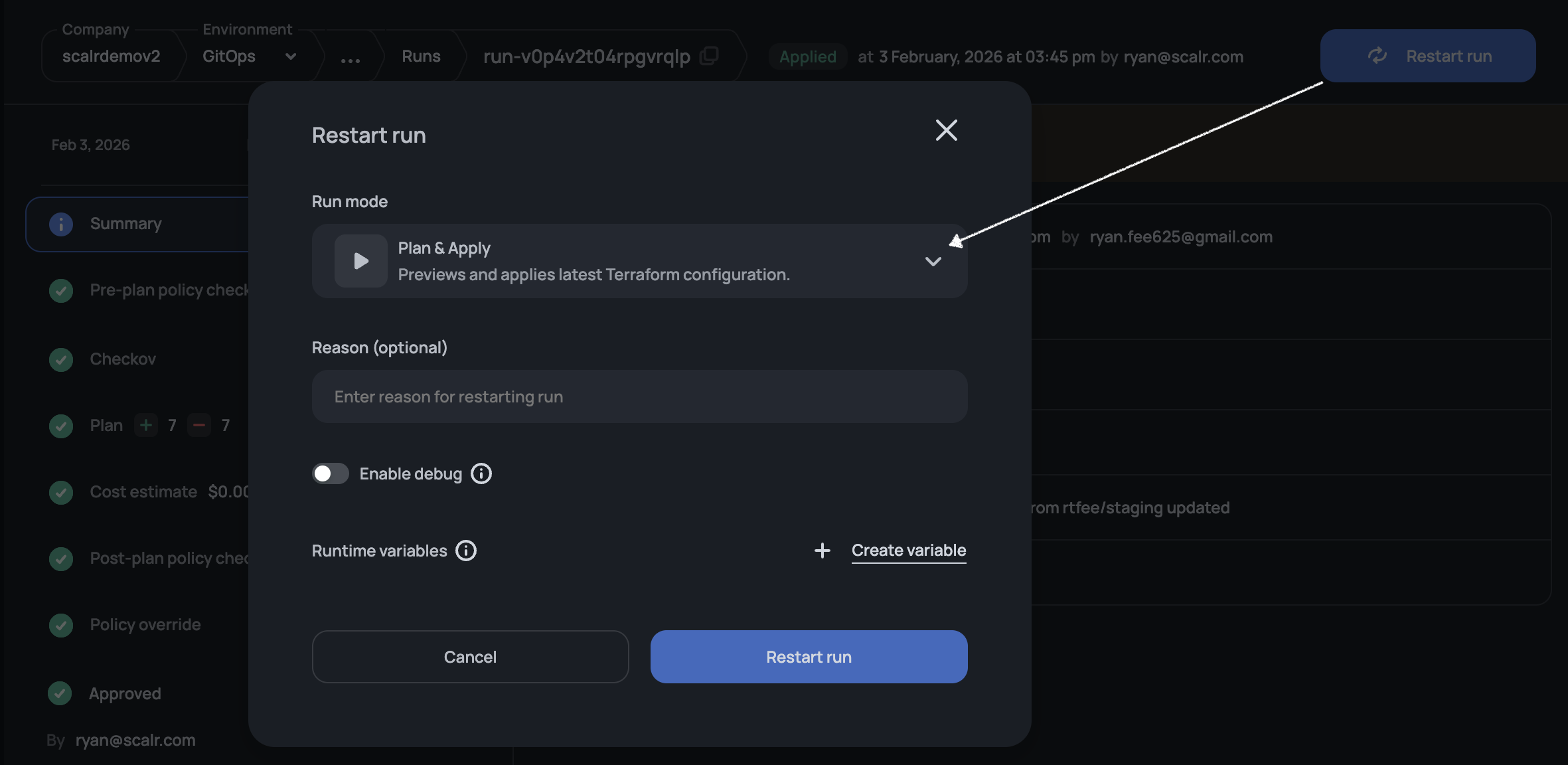 Runs can be restarted directly from the run dashboard. When a specific run is selected, all attributes from the original run will be applied to the new run. For example, suppose the original run mode was a targeted apply, and a user selects to restart that run. In that case, the new run will be a targeted apply on the same resources unless the settings are explicitly changed.